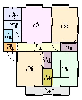 | 間取り | 3DK (和室:6畳) (洋室:6、6) DK6 B・T別室/水洗トイレ/洗濯機置場/給湯/シャワー/エアコン |