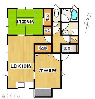 | 間取り | 2LDK (和室:6畳) (洋室:6) LDK10.5 駐車場は縦列2台の場合、賃料に含み |