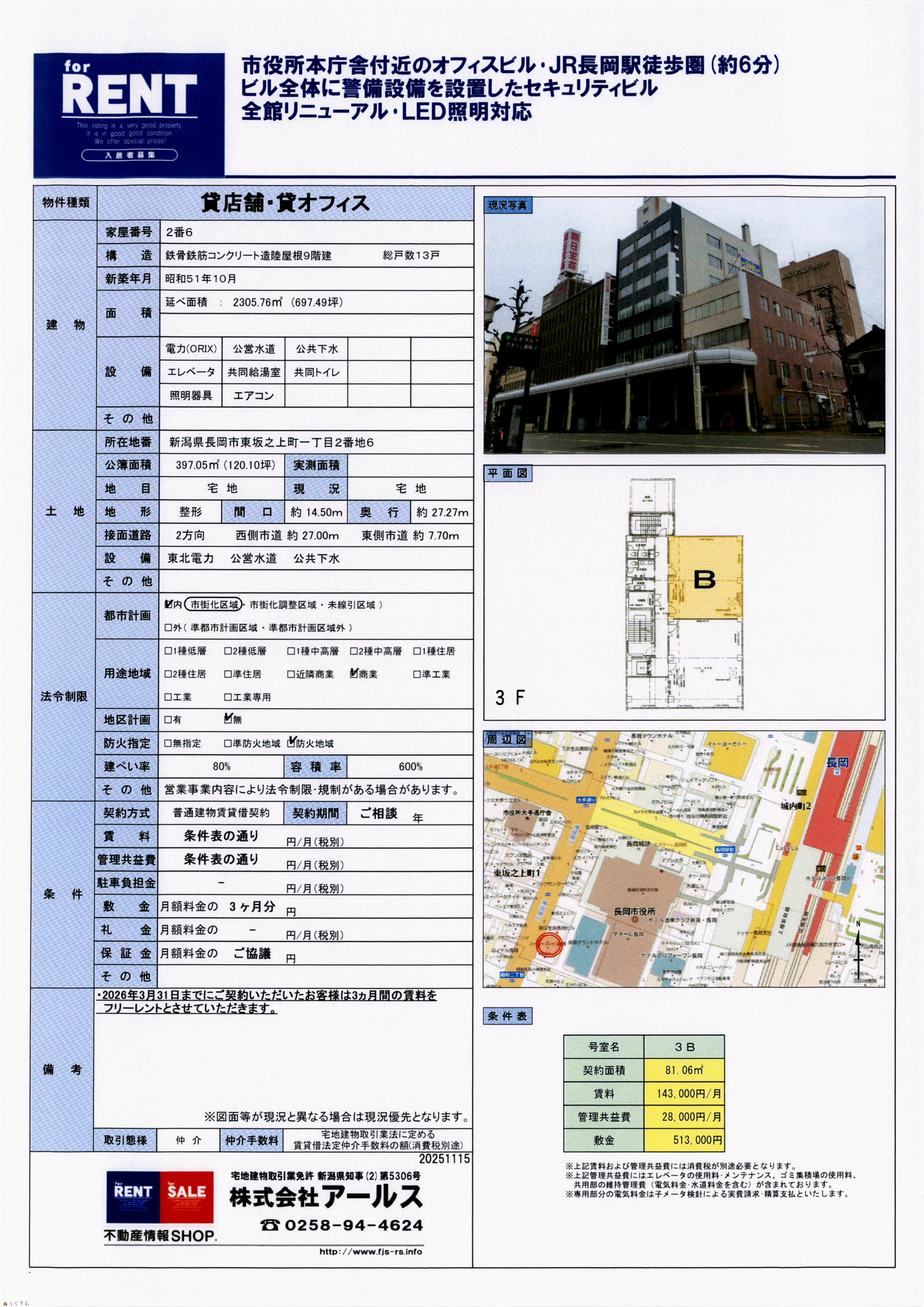 | GrowINビル B号室 新潟県長岡市東坂之上町1丁目2番地6 | 81.06㎡ (24.52坪) - 3階 | 49年 - | 14.3万円 28,000円/月 なし | 51.3万円 なし なし | 事務所 鉄骨鉄筋コン |