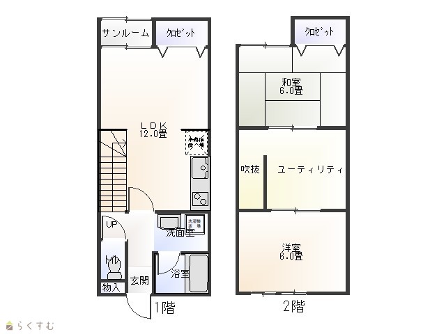 | 設備 | 閑静な住宅街、バス停近く、メゾネット、駐車2台可、カーポートあり、駐車場1台無料、システムキッチン、2口コンロ、バストイレ別、温水洗浄便座、洗面所独立、エアコン、都市ガス、サンルーム、全居室フローリング、洗濯機置場 室内、脱衣所、クロゼット2ヵ所、TVモニター付きインターホン、各居室照明、インターネット接続可、内装リフォーム済み、即入居可、保証会社利用可能、礼金不要、高齢者相談、新婚・カップル向け、メゾネット式 | ||