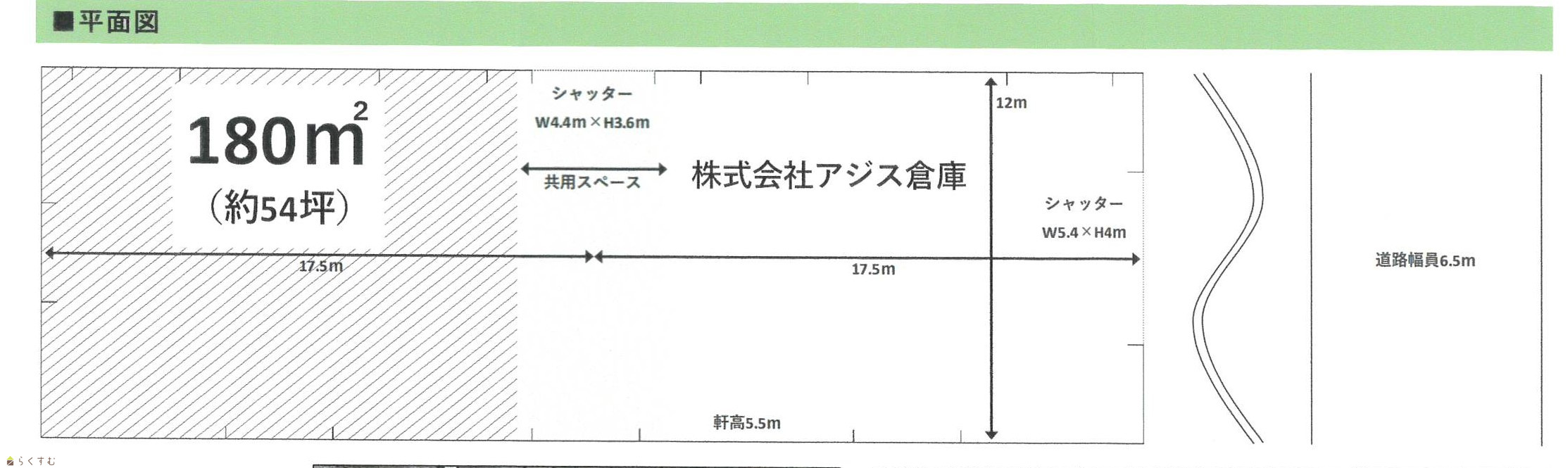 | 備考 | 1階部分一部貸(倉庫管理規則あり) 天井クレーン付(2.8t)、 敷地内消雪設備あり、 トイレ・水道は使用できます |