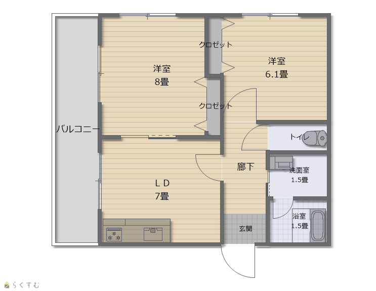 | 間取り | 2DK (洋室:8、6.1) DK7 |