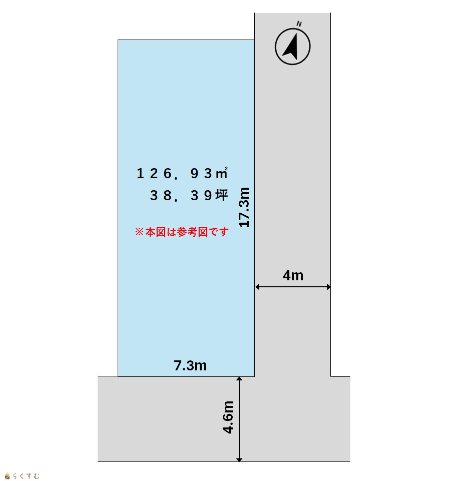 | 形状 | 間口 7.3m × 奥行 17.3m | 道路 | 北東ー約4m市道/南東ー約4.6m市道 ※隅切りなし |