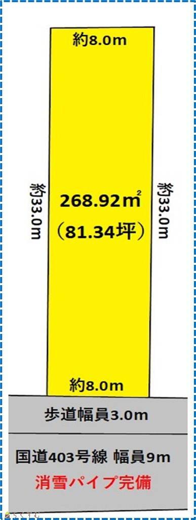 | 形状 | 間口 8.0m × 奥行 33.0m | 道路 | 国道403号線 幅員15.0m 前面道路消雪パイプ完備 |