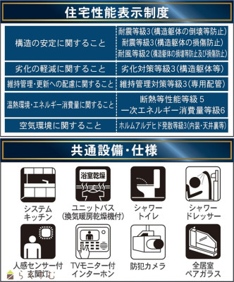 | 設備 | 整形地、前面道路6m以上、日当り良好、閑静な住宅街、設計住宅性能評価付き、建物確認・完了検査済証あり、LDK15畳以上、駐車場2台以上、駐車場3台以上、庭あり、TVインターホン、複層ガラス、ディンプルキー、システムキッチン、3口コンロ、ガスコンロ設置済み、追いだき機能付き、浴室暖房乾燥機、バス1坪以上、温水洗浄便座、シャワー付き洗面台、24時間換気システム、都市ガス、上水道、下水道、電気、全居室収納あり、シューズBOX | ||