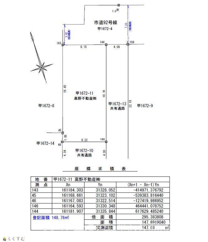 | 形状 | 間口 8.15m × 奥行 18.16m | 道路 | 北/公道3.82m,東/私道4.08m,南/私道4.08m |