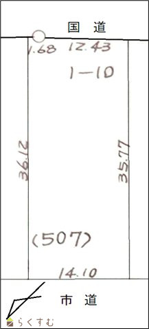 | 形状 | 間口 14.1m × 奥行 36.0m | 道路 | 南東側:国道8号線、北西側:長岡市道 |