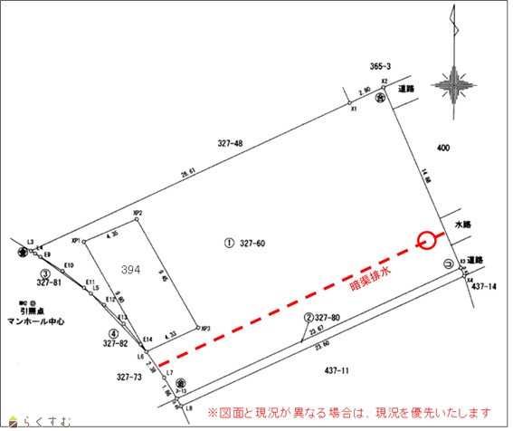 | 備考 | 現況有姿での売買となります。 コンクリート板、耕作物は売主の負担で撤去します。 敷地内南側の隣地境界線より約3mの地中に柏崎市所有の暗渠排水が埋設されています。 建築物の制限があります。 暗渠排水点検のためのマンホールがあり、年1回程度の点検立ち入りがあります。 地目:宅地・畑(農地転用申請費用は売主負担です。) 仲介手数料別途 |