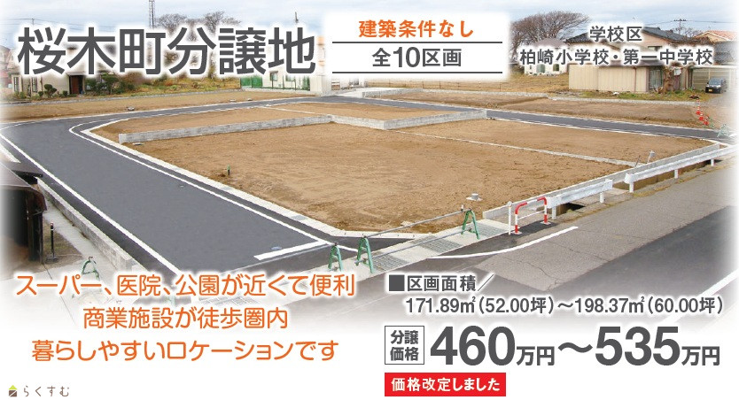 ◆価格改定◆建築条件なし◆桜木町分譲地残り5区画◆460円~535円◆スーパー・医院・公園が近くて便利。 商業施設が徒歩圏内で暮らしやすいロケーションです。