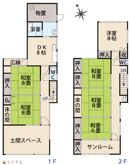 6DK (和室:8畳、8畳、8畳、8畳、6畳) (洋室:8) DK8 敷地内に別棟物置有 |