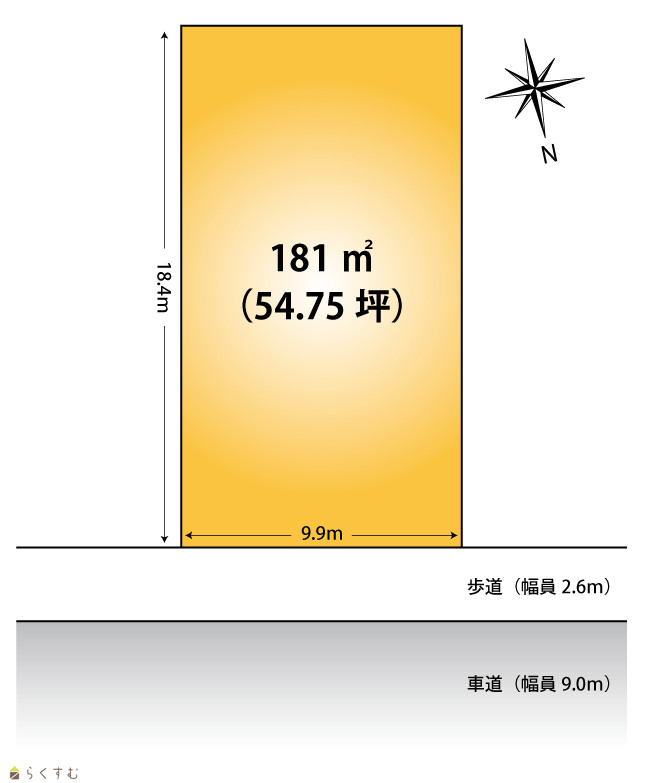 | 形状 | 間口 9.9m × 奥行 18.4m | 道路 | 北側公道(幅員16.1m) |
