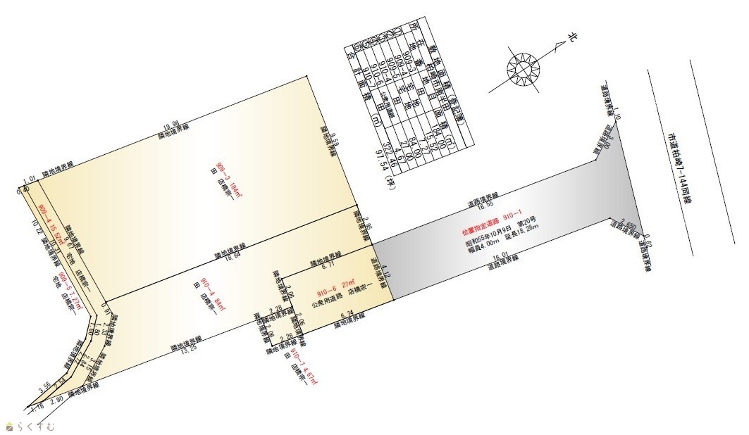 | 形状 | 間口 16.66m × 奥行 20.99m | 道路 | 位置指定道路910-1 |
