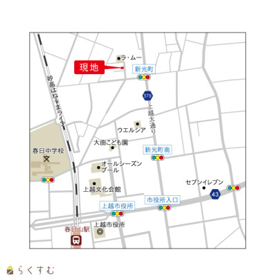 セブン-イレブン 上越新光町店(コンビニ)まで830m ローソン 上越木田店(コンビニ)まで940m ラ・ムー 上越北店(スーパー)まで270m 原信春日山店(スーパー)まで1200m ウエルシア上越新光町店 (調剤薬局)(ドラッグストア)まで380m |