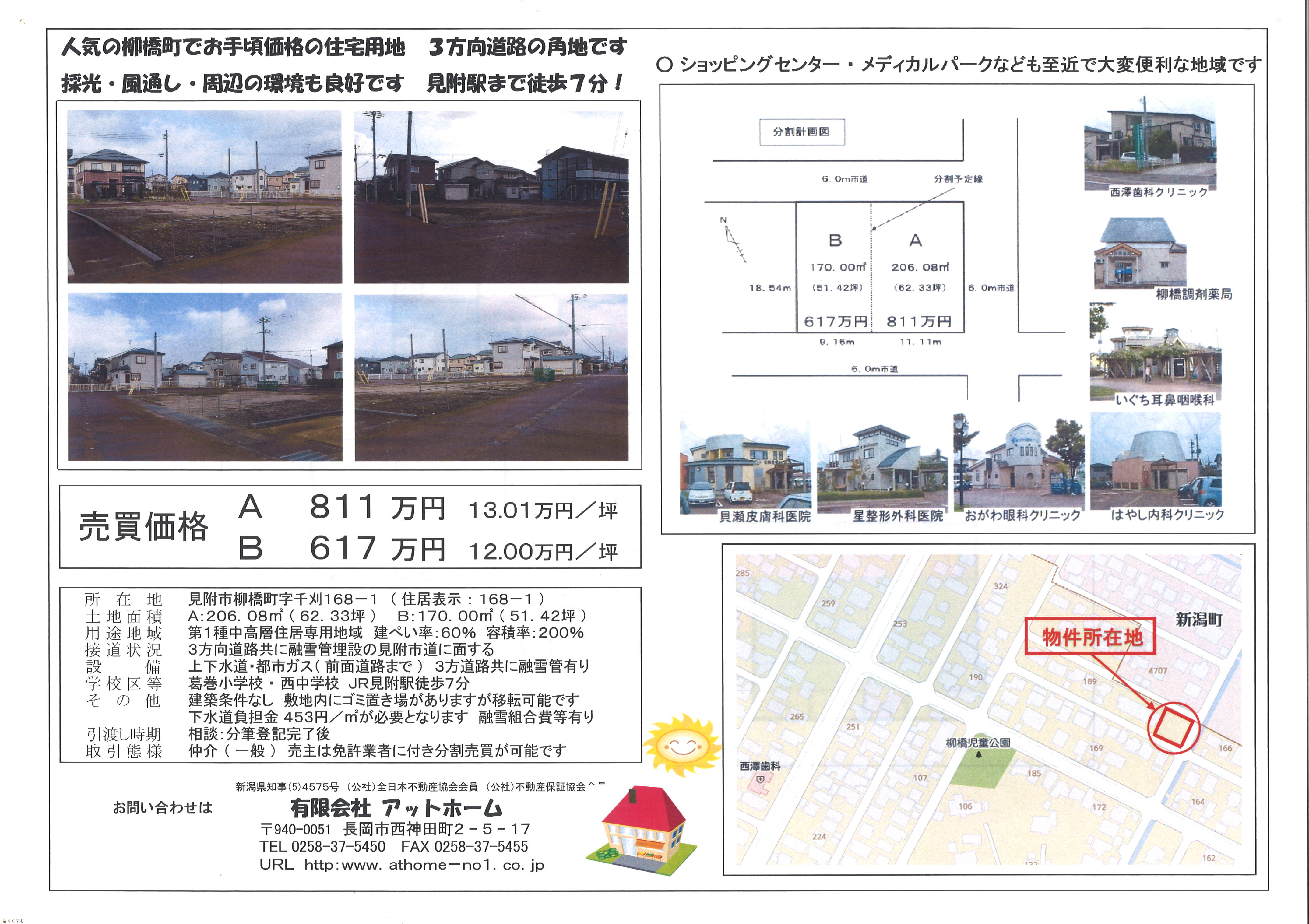 | 形状 | 間口 9.16m × 奥行 18.54m | 道路 | 南側・北側共に見附市道(融雪道路) |