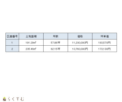 | 備考 | ■土地面積 【区画1】191.29m2(57.86坪)~【区画2】205.46m2(62.15坪) ■販売価格 【区画1】1,076万円~【区画2】1,120万円 ■坪単価 【区画1】193,570円~【区画2】173,130万円 ・ハーバーハウス株式会社の建築条件付きです。 ・仲介手数料が発生します。 ・敷地図の敷地面積については、面積確定前の為、差異が生じる場合があります。 【区画1】上下水道・ガス敷地内引込済。 【区画2】上下水道・ガス現況前面道路、売主負担にて敷地内へ引込みのうえ引渡し。 |