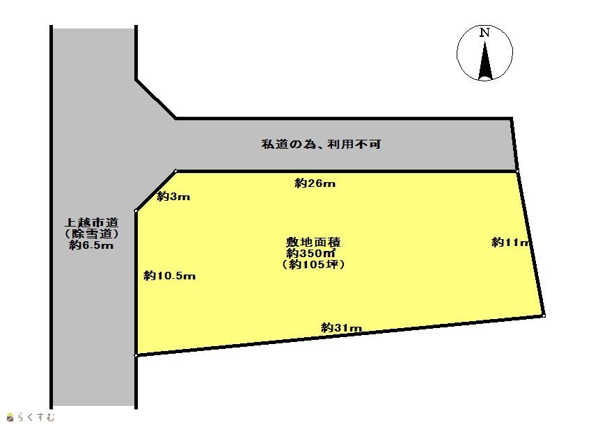 | 形状 | 間口 11m × 奥行 32m | 道路 | 西側道路、幅員約6.5m、上越市道(除雪道) |