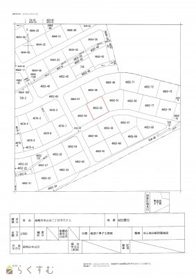 | 設備 | 高台に立地、整形地、南側道路面す、更地、閑静な住宅街、建築条件なし、所有権、即引き渡し可、側溝、電気、都市ガス(宅地内)、上水道(宅地内)、下水道(宅地内)、住宅向け | ||