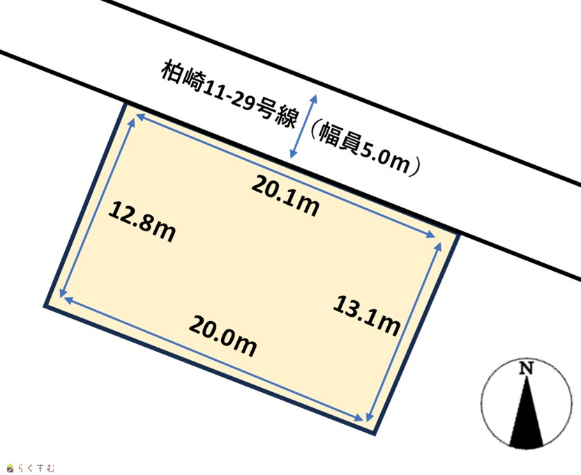 | 形状 | 間口 20.1m × 奥行 12.8m | 道路 | 北東側:柏崎11-29号線(幅員:5.0m) |