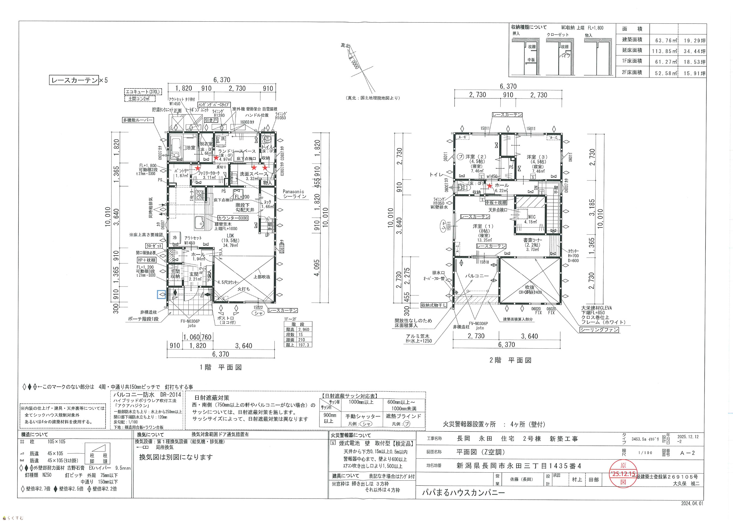 | 建物面積 | 1階 61.27㎡/ 2階 52.58㎡/ 計 113.85㎡ /34.43坪 | ||