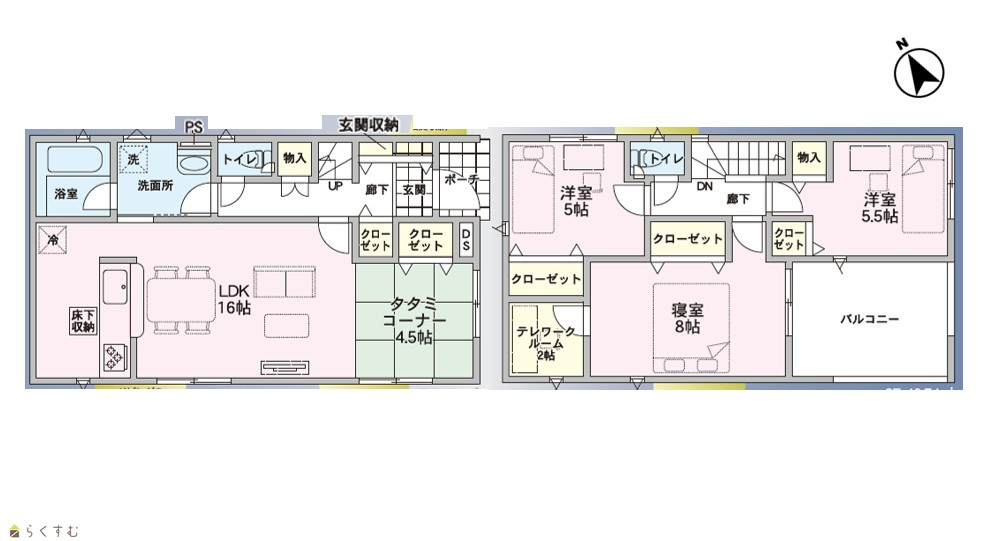 3LDK (洋室:8.0、5.5、5.0) LDK20.5 2階に2帖のテレワークルーム有 |