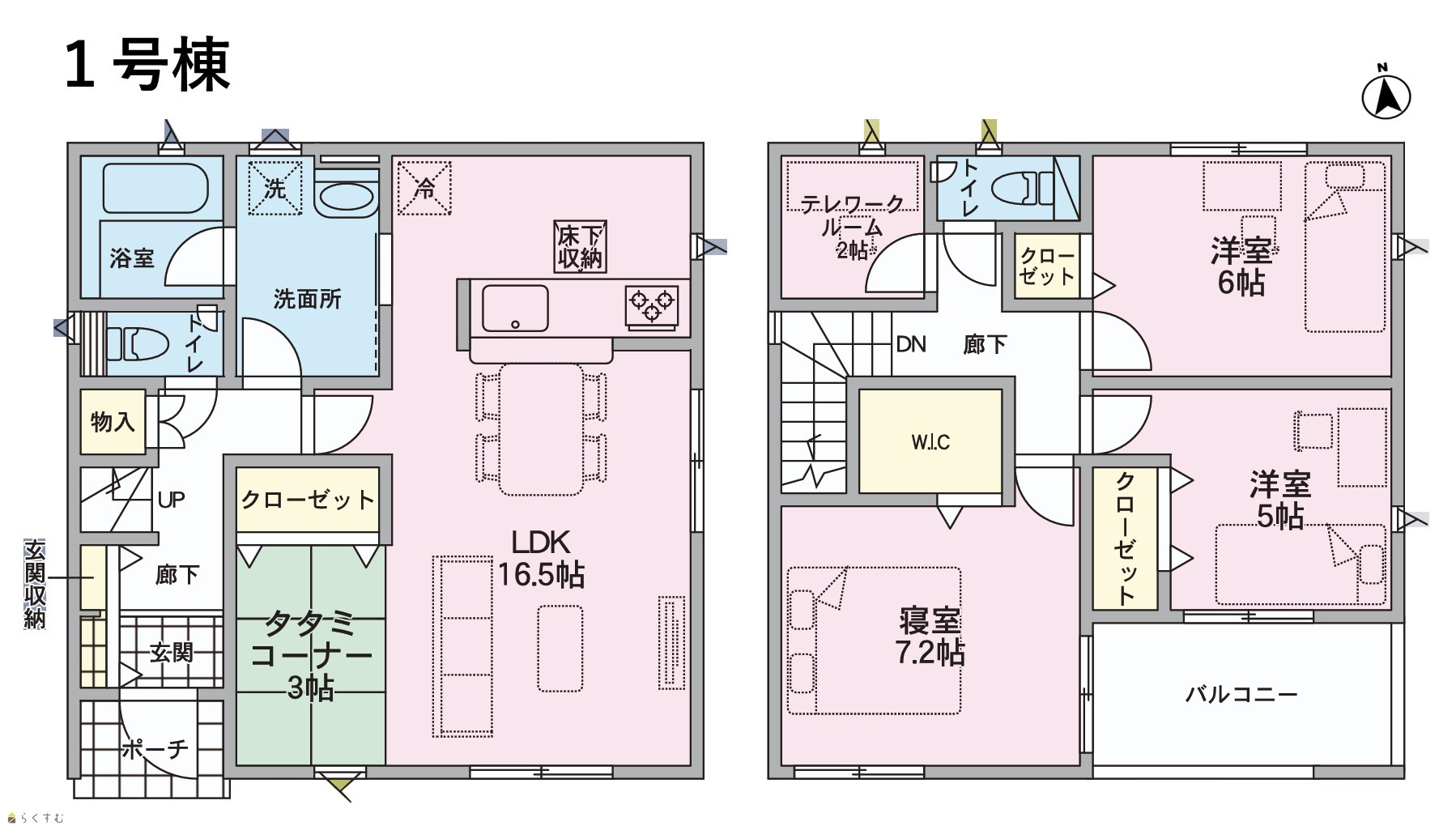 3LDK (洋室:7.2、6.0、5.0) LDK19.5 1階LDKに3帖のタタミコーナー、2階に2帖のテレワークルーム有 |