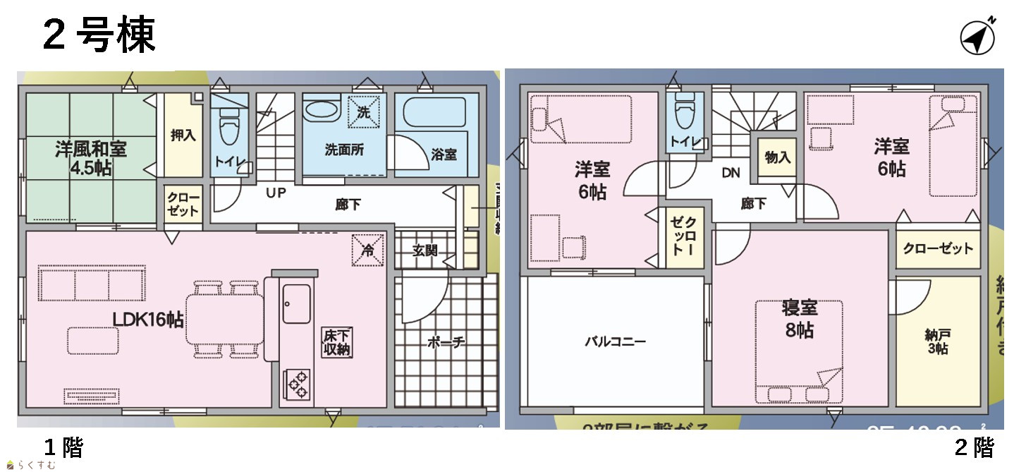 4LDK (和室:4.5畳) (洋室:8.0、6.0、6.0) LDK16 2階に納戸3帖有 |