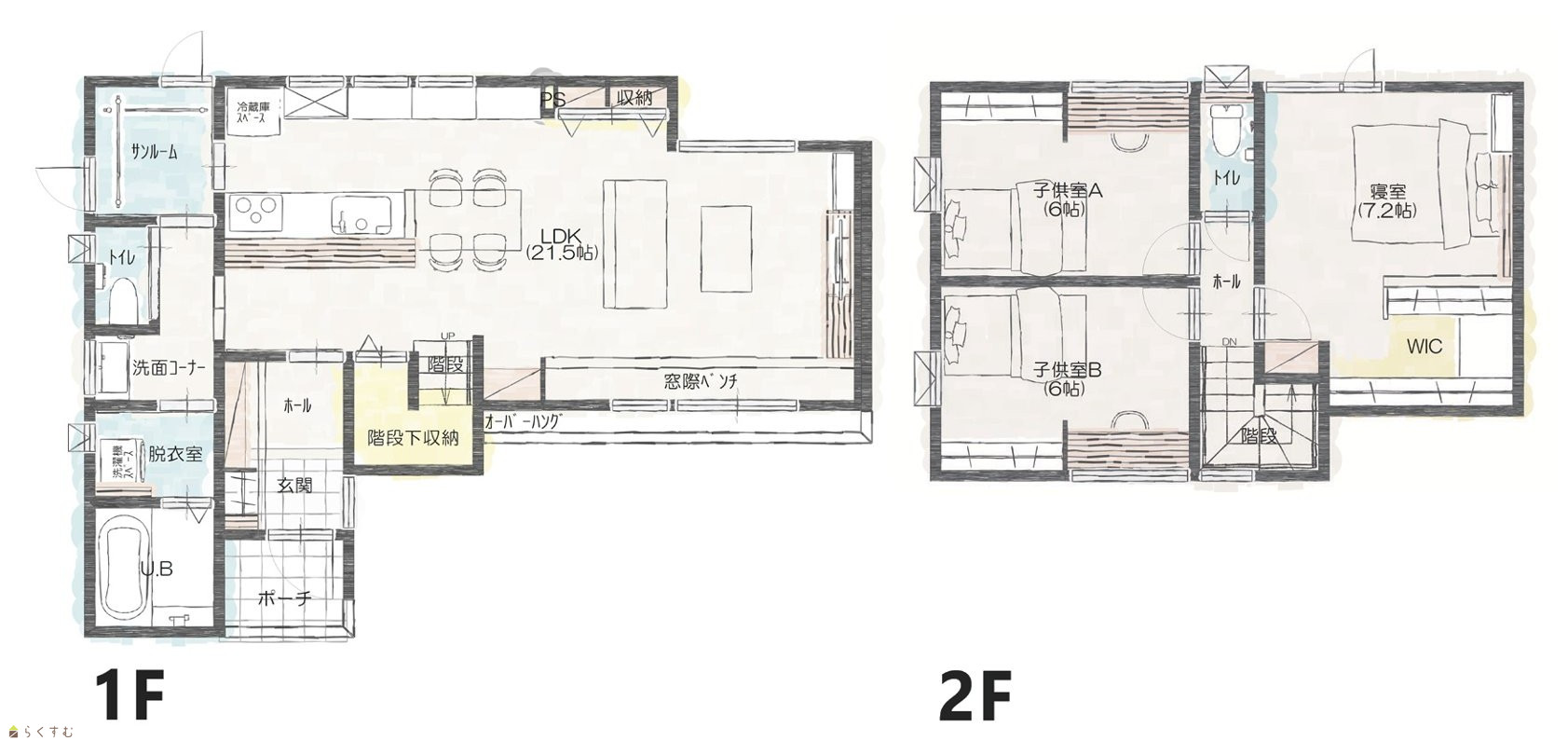 3LDK (洋室:7.2、6.0、6.0) LDK 21.5 ■土地+建物+外構 セットの価格です。 |