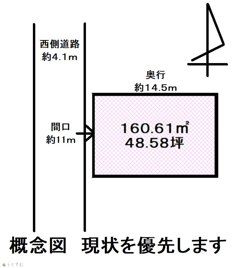| 形状 | 間口 11m × 奥行 14.5m | 道路 | 西側約4.1m |
