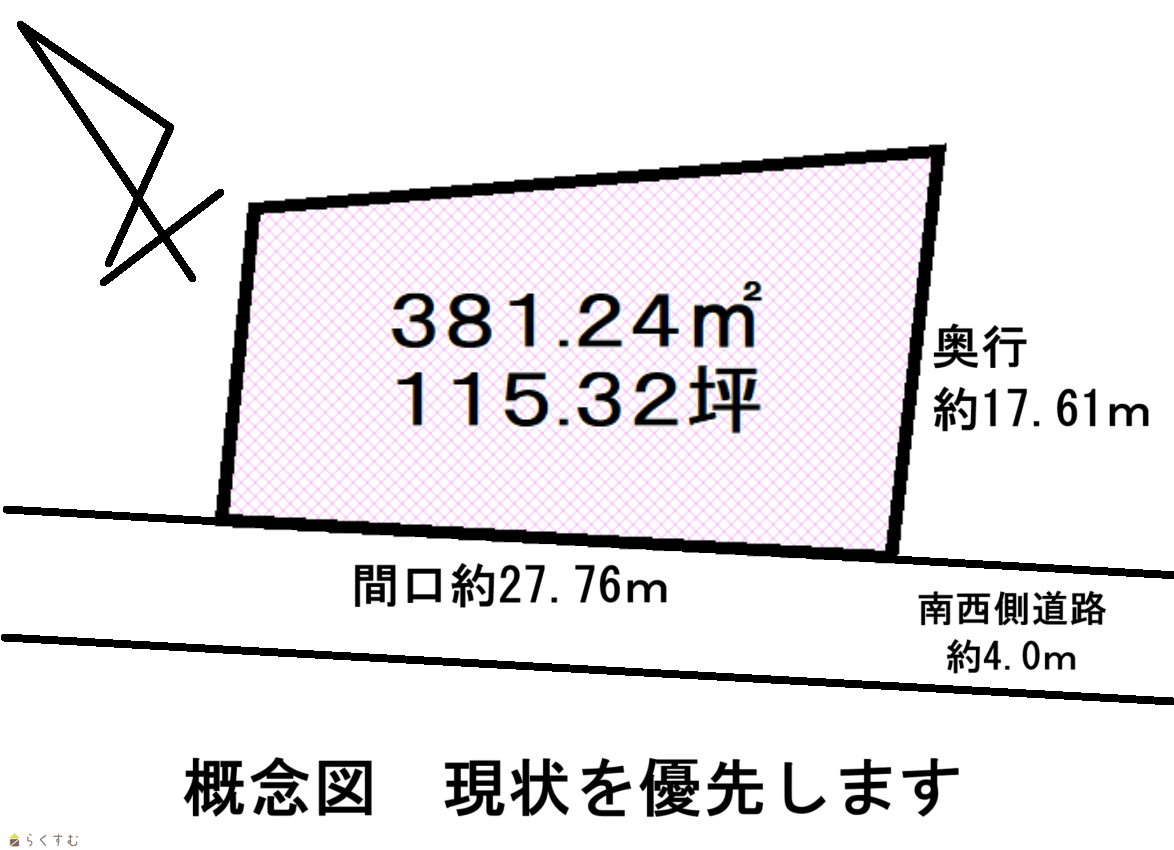 | 形状 | 間口 27.7m × 奥行 17.6m | 道路 | 南西約4.0m |
