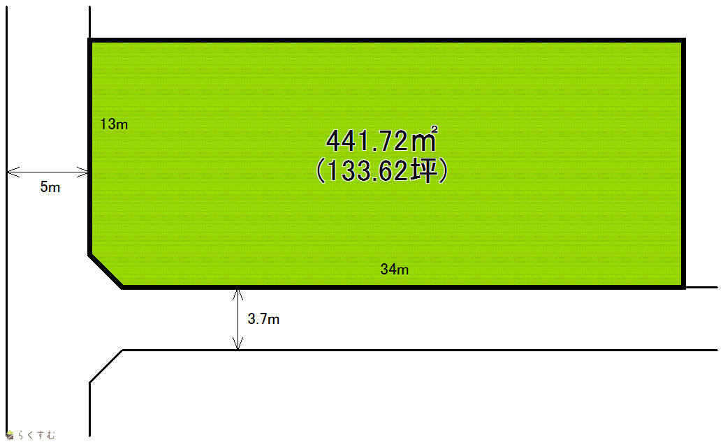 | 形状 | 間口 13m × 奥行 34m | 道路 | 西 5m 南 3.7m |