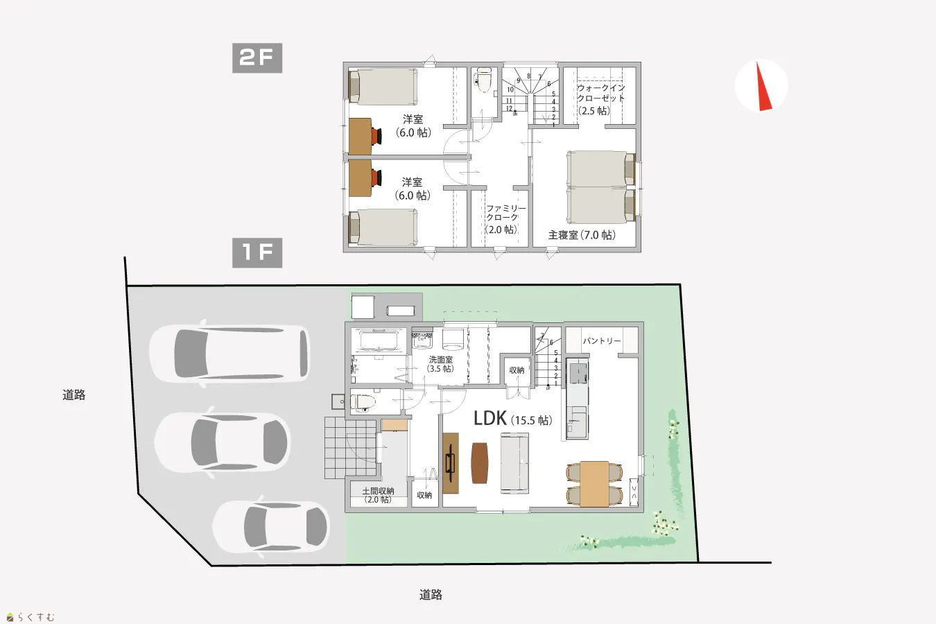| 角地で駐車3台可能、15.5帖のLDKはキッチンからリビングが見渡せ、家族の様子を感じながら家事ができます。3.5帖の広いランドリールームには物干し2本分のスペースと畳半分の収納付き。玄関・ホール・リビング・キッチンのパントリー、2階のファミリークロークや各洋室のクローゼット、主寝室の2.5帖ウォークインなど、充実の収納で暮らしやすさ◎。2階にもトイレがあり家族の毎日を快適に支えます。 | |||