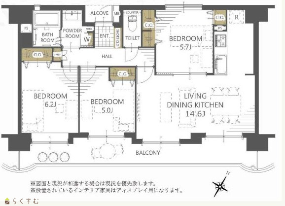 3LDK (洋室:6.2、5.7、5.0) LDK14.6 |