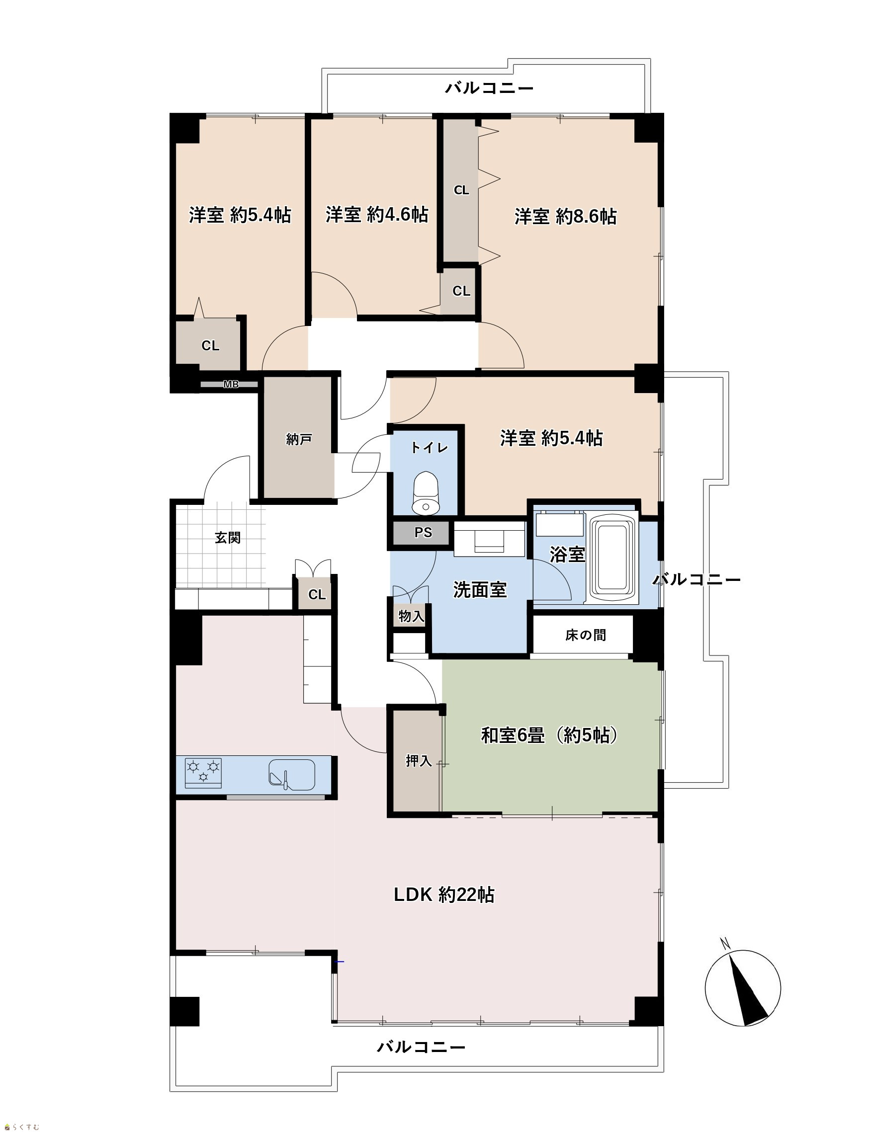5LDK (和室:5.5畳) (洋室:8.6、5.4、5.4、4.6) LDK22 |
