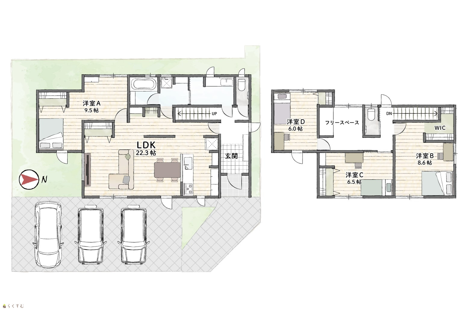 4LDK (洋室:9.5、8.6、6.5、6) LDK22.3 |