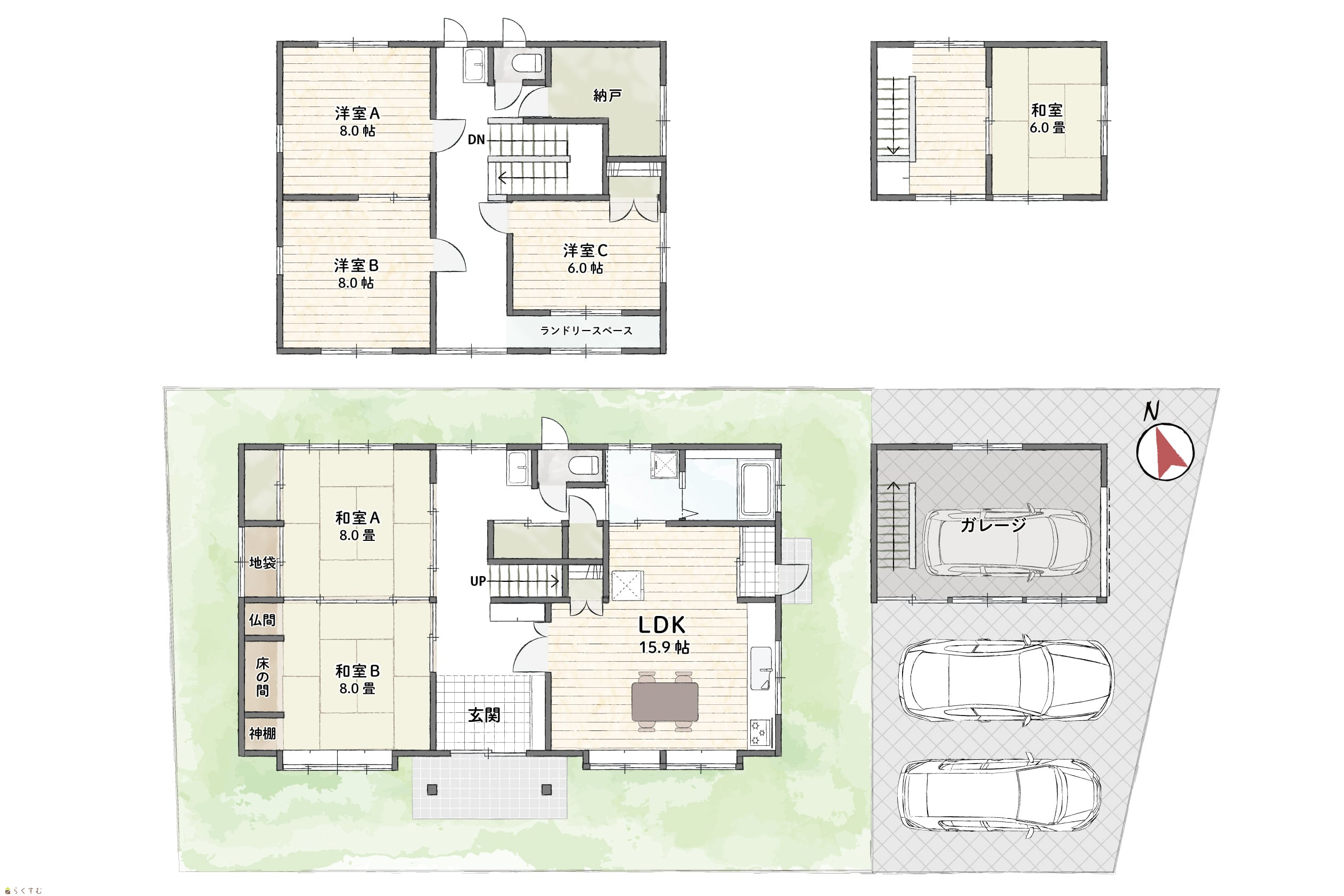 5LDK (和室:8畳、8畳) (洋室:8、8、6) LDK15.9 納戸、2階建のガレージ有 |