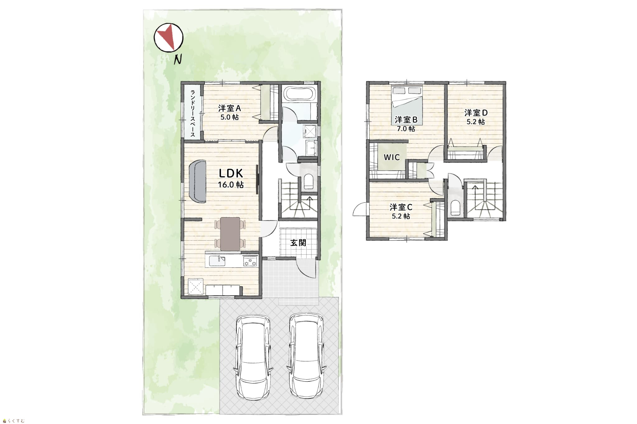 4LDK (洋室:5、7、5.2、5.2) LDK16 ランドリースペース有 |