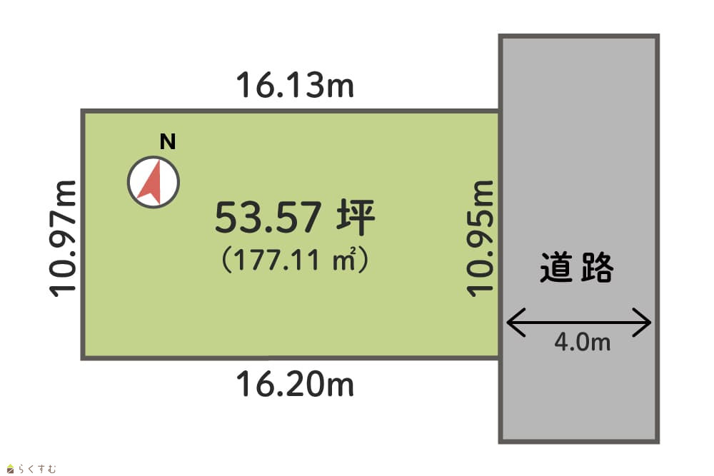 | 形状 | 間口 10.9m × 奥行 16.1m | 道路 | 東側 約4.0m 私道 (位置指定道路) |