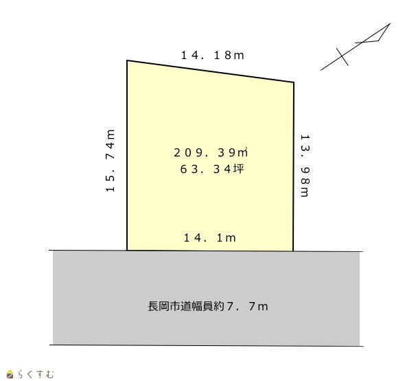 | 形状 | 間口 14.1m × 奥行 14m | 道路 | 東側長岡市道 幅員7.7m |