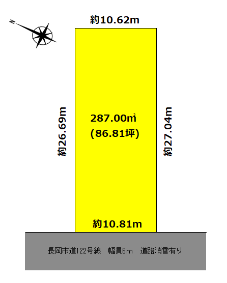 | 形状 | 間口 10.78m × 奥行 27m | 道路 | 前面道路6m 消雪パイプ有 |