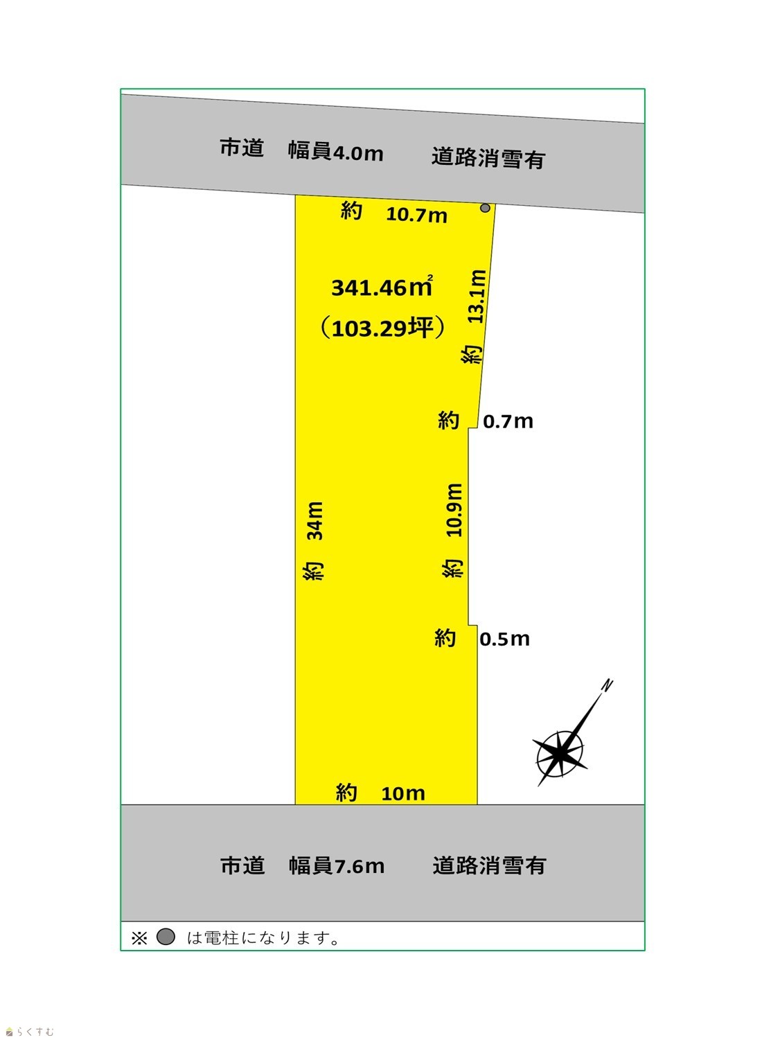 | 形状 | 間口 10.7m × 奥行 34m | 道路 | 第42条1項1号幅員4.0m / 7.6m |