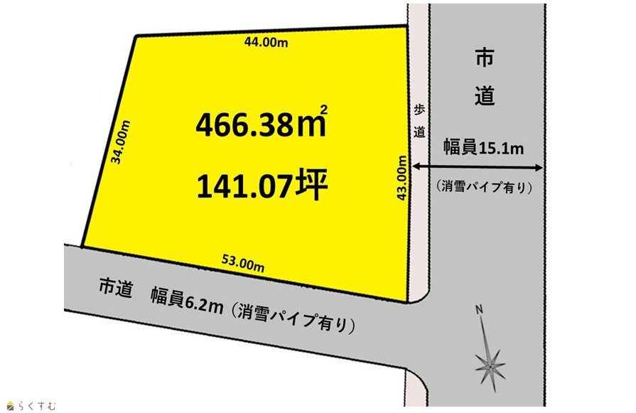 | 形状 | 間口 43m × 奥行 53m | 道路 | 東側:市道幅員15.1m消雪パイプあり 南側:市道幅員6.2 |