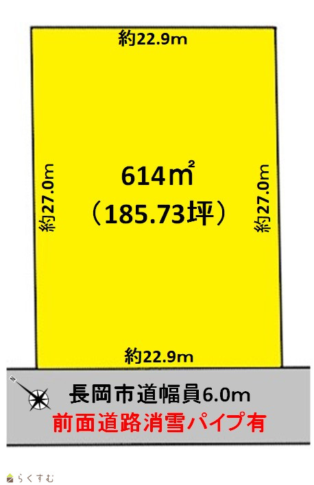 | 形状 | 間口 22.9m × 奥行 27m | 道路 | 長岡市道幅員6.0m 前面道路消雪パイプ有 |