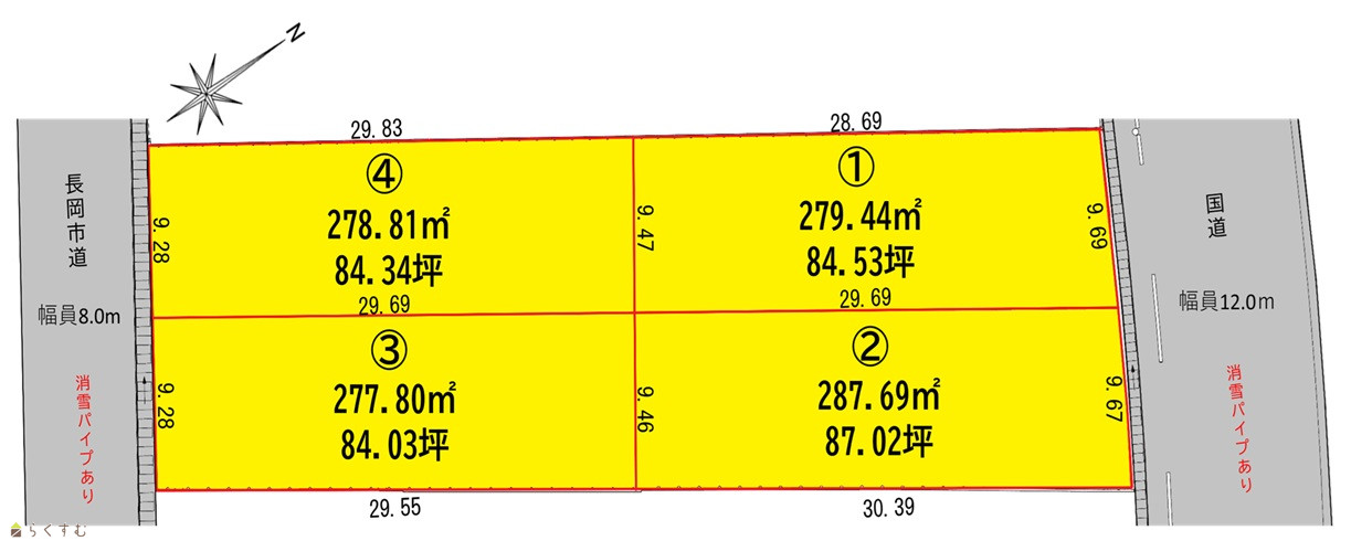 | 備考 | ・消雪年会費8,000円(区画3、4のみ) ・確定測量後、寸法、面積、価格等に変更が生じる場合があります。 ・本土地には東北電力の高圧電線による地役権設定がある箇所があります。 ・地目は宅地に変更予定。 ・区画1、2には区画内に浸透桝が設置されます。区画3、4には区画内に集水桝が設置されます。 【おすすめポイント】 ①花園にも近く利便性の高いエリア。各区画80坪以上の広々とした敷地です。 ②市民体育館や中央図書館が徒歩10分圏内。 ③スーパーやドラッグストア等が車で1分でお買い物に便利です。 ④前面道路に消雪パイプ完備。冬季も安心です。 ⑤立川総合病院まで車で5分で急な入院や通院に対応しやすい。 ⑥国道17号線まで車で3分。車での移動にも便利。 |