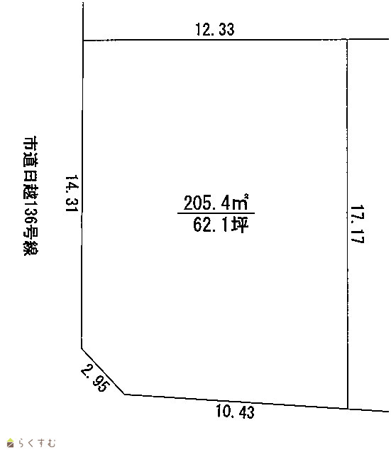 | 形状 | 間口 10.4m × 奥行 17.1m | 道路 | 南側市道幅員5m 西側市道幅員9.1m |
