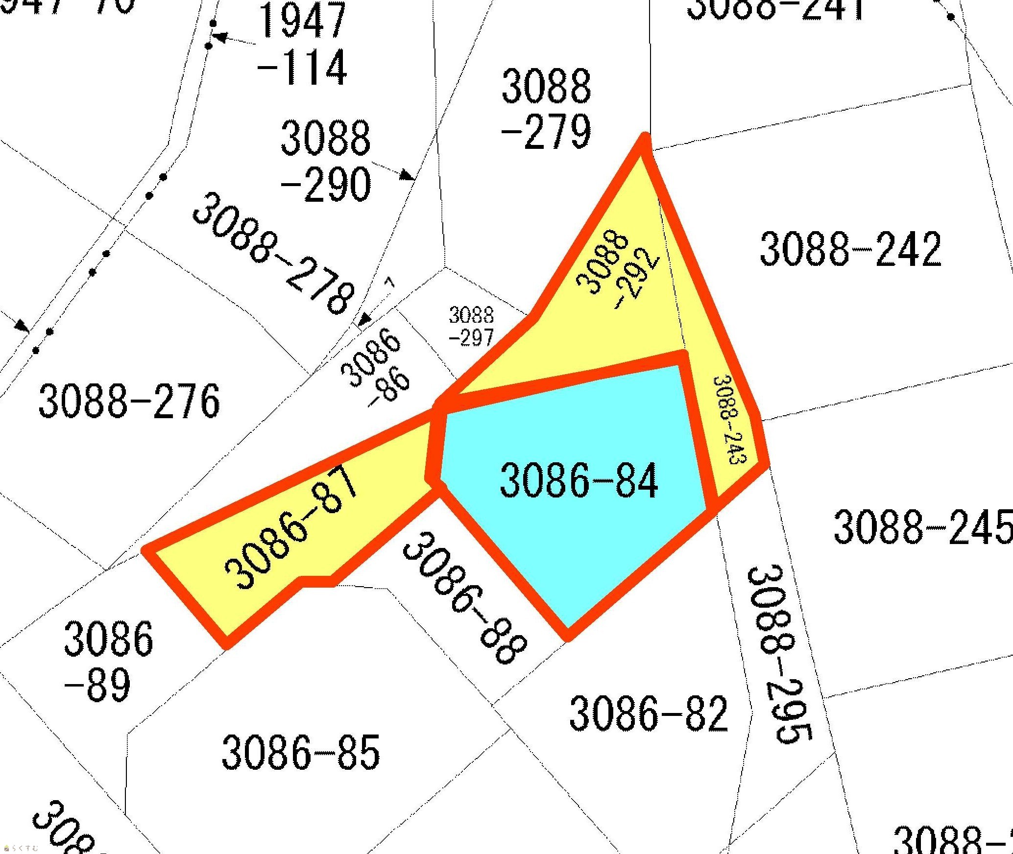 | 備考 | 宅地 他3筆あり 3086-87 公衆用道路 58㎡ 3088-243 雑種地 22㎡ 3088-292 山林 37㎡ |