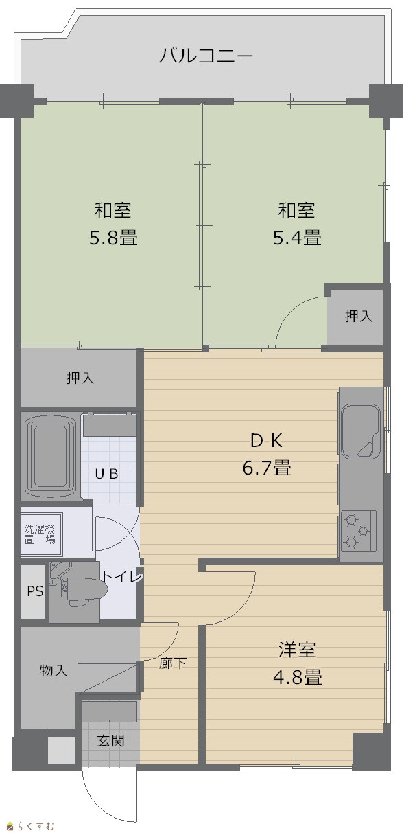 3DK (和室:5.8畳、5.4畳) (洋室:4.8) DK6.7 ※記載の専有面積は登記簿面積を記載しております。※バルコニー面積は概ねの面積です。 |