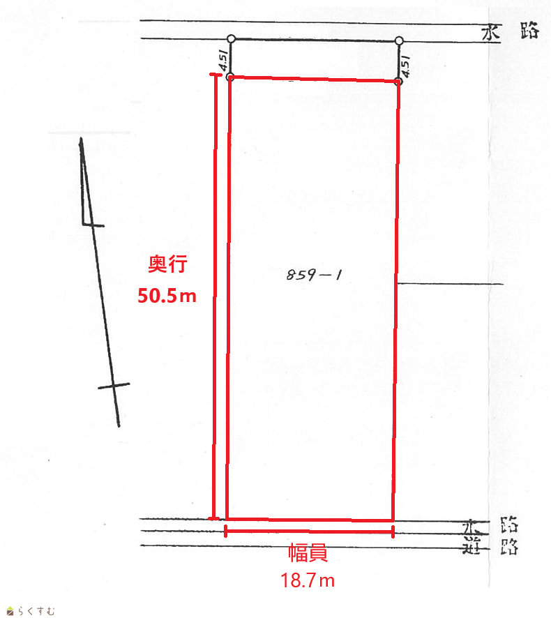 形状 間口 18.7m × 奥行 50.5m 道路 北(6.5m) 南(7.3m)