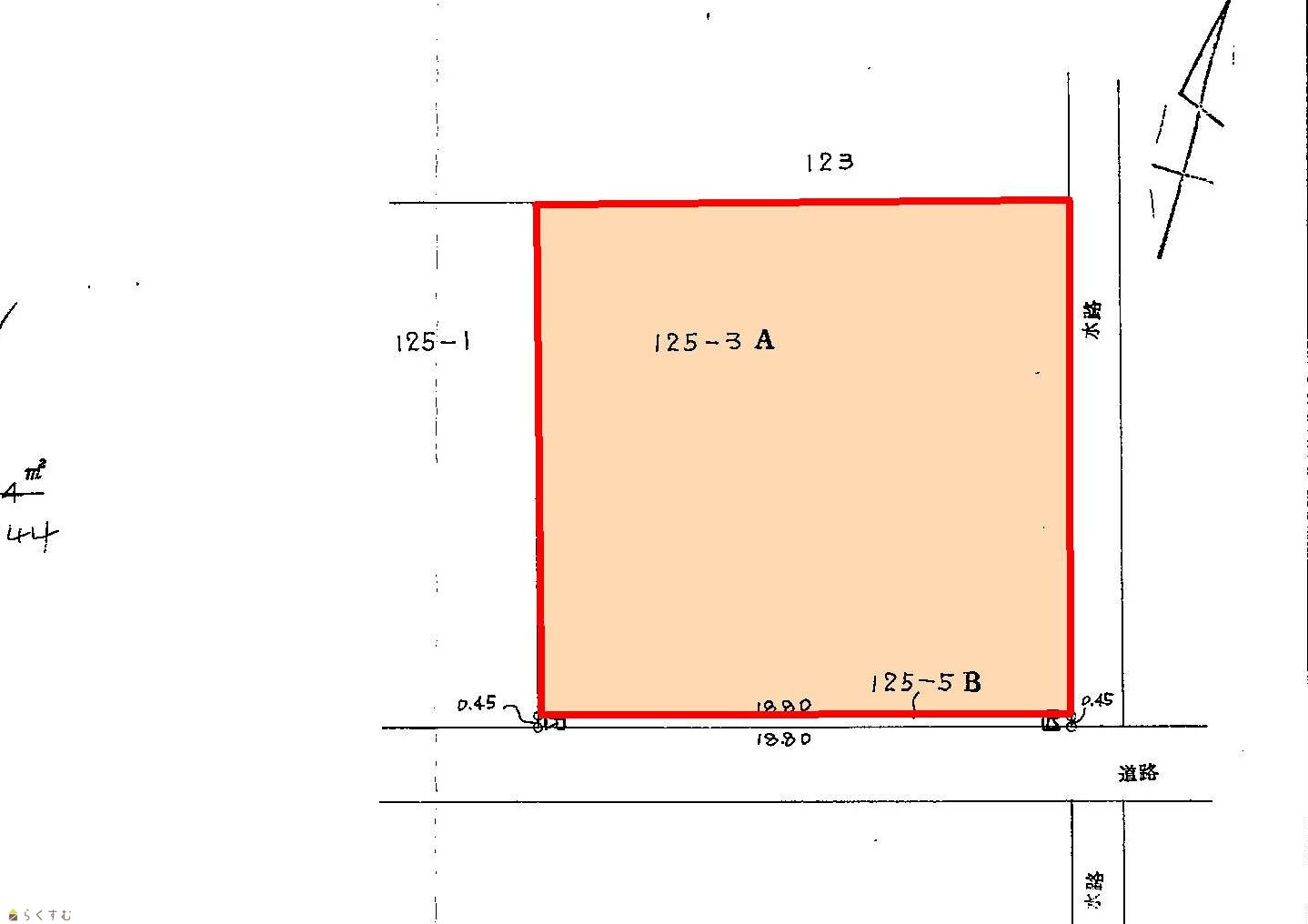 | 形状 | 間口 18.8m × 奥行 18.38m | 道路 | 三条市道 三中石上線 |
