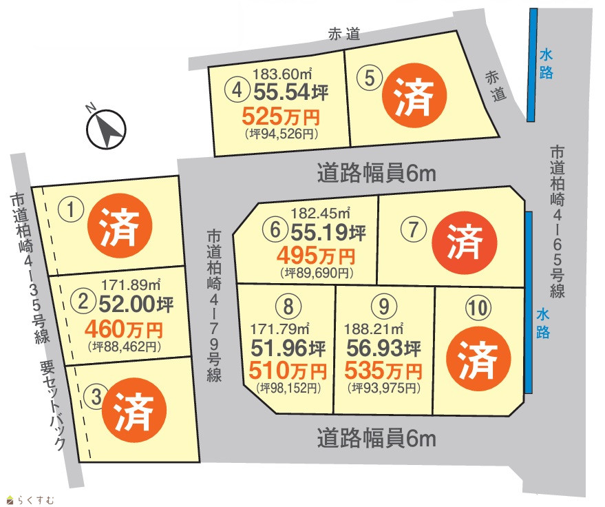 | 備考 | ※電柱が設置される区画があります。 ※光ケーブルによって固定電話を提供する光回線電話のエリアです。 ※売主につき仲介手数料はありません。 ※西側:市道4-35号線は幅員4m以下のため道路中心線より2mの セットバックが必要です。 |