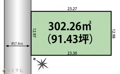 | 形状 | 間口 12.97m × 奥行 23.30m | 道路 | 北西側市道 7.4m |
